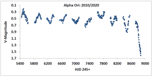 "The most recent measurements put the visual magnitude of Betelgeuse at about +1.66, the dimmest its been in our 25 years of photometry," says Edward Guinan of Villanova University.